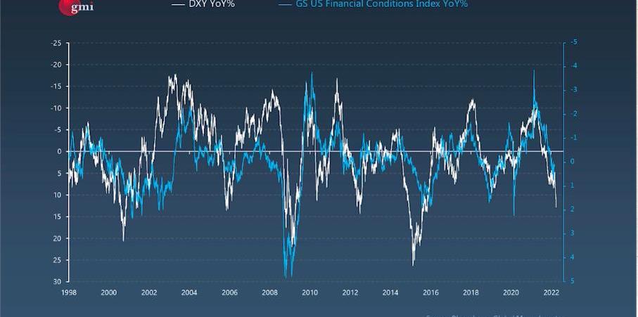 美元的變化與金融條件指數息息相關。隨著美元的上升,金融條件的收緊,ISM和增長率都會下降。所以我一直在強調我們需要關注美元,它是一個非常關鍵的變量。