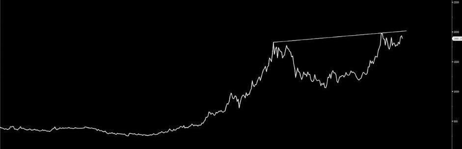 下一張圖是黃金的走勢曲線,黃金在負實際利率下表現良好,且對增長有一定的前瞻性。雖然它現在的交易并不順利,但我覺得如果未來全球增長放緩,黃金勢必會走高,所以我們要持續關注它的動態。