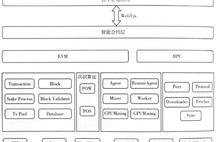 以太坊技術層面采用分層架構。從上至下分別為應用層,合約層,協議層。協議層包含了EVM虛擬機,區塊管理,KV數據庫,共識算法,P2P網絡等基本組件。智能合約層構建了以太坊豐富的DApp生態。