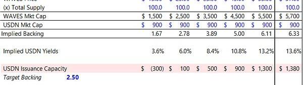 而為了讓收益率不下降,WAVES市值就需要持續增長。一旦支持資產開始下降——USDN收益率將會下降:在6.60倍的支持收益率為21.8%,2.5倍時收益率為5.4%。
