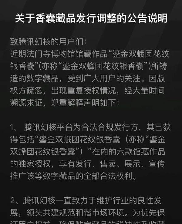 第一,雙方顯然都認為問題不在自己,而事件的矛頭便直指授權方,不過需要注意的是雙方的公告內都沒有將授權方或版權方等同于數字藏品實物的擁有者法門寺,據元飛船了解,數字藏品的發行方并非一定是版權方,當下存在不少版權方將自己的數字藏品衍生版權授權于第三方公司,由第三方公司對接數字藏品發行平臺的情況。