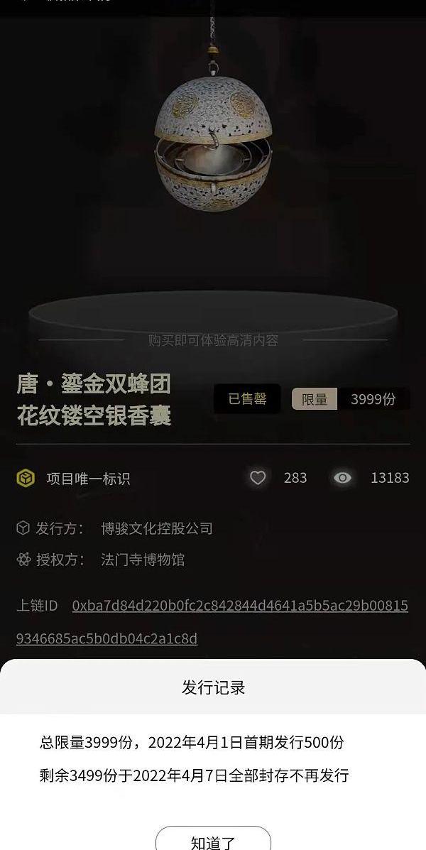 XRP/HKD-2.75%4月2日,幻核更新的發售預告中出現了一款法門寺博物館名為“唐鎏金雙蛾團花紋銀香囊”的數字藏品,該預告一上架便被藏友指出與前一日Hi元宇宙發行的數字藏品重合。
