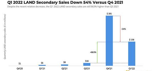 與此同時,相對于2021年第二季度,初級LAND銷售增長了23%。初級銷售的對象是新發行的LAND地塊,通常出售給合作伙伴或通過拍賣。盡管如此,2021年第一季度,主要LAND銷售額僅占市場LAND總銷售額的12%。