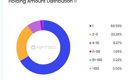 項目的持有集中度是否過高是購買項目前需要考量的指標之一。如果大戶或者項目方持有很多項目中的NFT,集中賣出將會影響價格,進而對項目產生不利影響。你可以通過NFTGo.io查看任何項目的持有數量分布,尤其是需要觀察項目中“51-100”持有者地址占比數量。