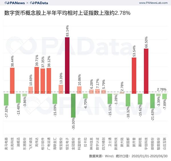 與同時期上證綜指對比,數字貨幣概念股上半年相對上證綜指漲幅的中位數是2.78%,略好于大盤表現。其中,14只概念股跑贏大盤,恒生電子跑贏同期上證綜指83.14%,宇信科技和新開普也都跑贏大盤超50個百分點。另外13只概念股跑輸大盤,尤其是金冠股份、御銀股份、新國都、奧馬電器,股價相對同期上證綜指的跌幅都超過17%。