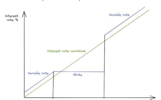 UpandOutCap:買方希望保證最高費率水平,同時支付比經典上限更低的溢價。作為回報,買方接受限制在預先確定的利率區間內的對沖。如果行使率超過限制率,則參考率將再次可變并與行使率成比例。