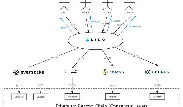 2.Lido按照一定的規則,每32個ETH一份,分給經過lidoDAO認可的各個節點運營商