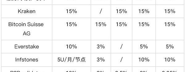 雖然stake賽道是一個藍海賽道,但是由于節點運營商之間提供的幾乎是完全同質化服務,不同非托管的STaaS服務提供商之間的價格競爭激烈。從下圖的費率表我們可以看出,非托管的STaaS服務提供商的收費要遠低于中心化交易所。