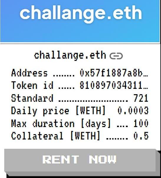 在reNFT平臺,NFT藝術品、虛擬土地NFT、游戲的NFT資產、NFT域名等均可出租給有需求的用戶,持有者們可以通過固定價格、期限和抵押品數量選擇出租他們的NFT。比如,在該平臺上,域名NFTChallange.eth的租賃信息顯示,某個域名的日租金為0.0003WETH,租期為100天,抵押物需價值0.5WETH。