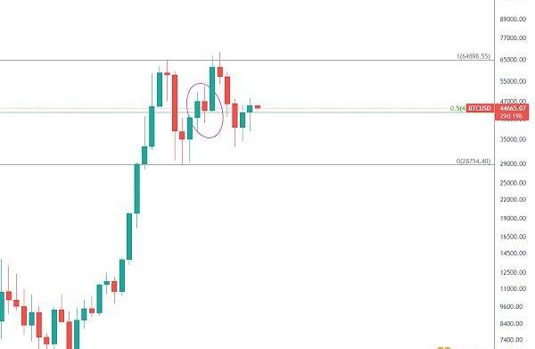 月線已收線,BTC未能站上頂底0.5回撤位47711美金上方,這與去年519大跌后筑底再反彈的情況不同,上圖可以看到前期月線是有效突破0.5壓制線,后面月線回踩后繼續向上拉升,所以這兩次反彈是有區別的。