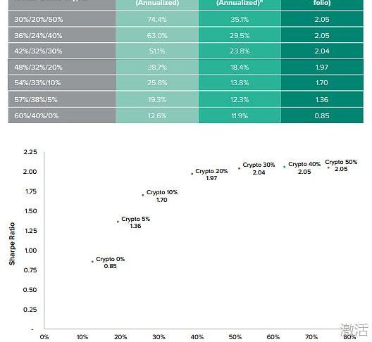 MPT是建立在一個原則之上的,一個適當多樣化的風險資產投資組合可以為既定程度的風險提供比那些資產單獨提供更高的回報。在過去三年中,將全球60/40股票和債券投資組合與1%、3%和5%的加密貨幣組合組集中在一起,將會帶來越來越高的回報,波動率略高,跌幅最大,但夏普比率高于單獨的全球60/40投資組合。增加該投資組合對加密貨幣一籃子的敞口將繼續改善夏普比率,直到加密貨幣的投資組合權重超過約40%。