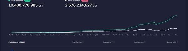 在Terra生態中,借貸協議Anchor作為“國有銀行”,承諾了19%-20%的超高活期收益率,以此吸收公眾存款。根據Coingecko數據,目前UST總流通為150億美金,官方基金的社區池擁有21億UST,而在Anchor中存款的UST為104億,占到扣除官方資金的UST總市值的80.6%,流通中的大部分UST都是為了獲得Anchor的高息而來。