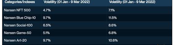 NFT類別之間的波動性不同。該指數的表現顯示,元宇宙和游戲NFT是年初至今波動最小的,而藍籌和藝術NFT在此期間波動最大。