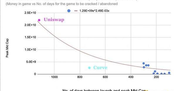 如果我們把DeFi協議視為游戲,那么有我們理由認為,隨著更多分叉項目的出現,人們會玩得越來越好,游戲被攻克的速度也會越來越快。換句話說,一個游戲被攻克的時間會越來越短。