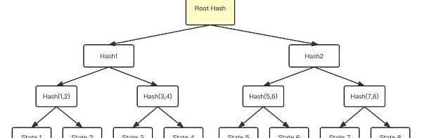對于每兩個狀態信息(例如State1/State2),我們可以根據某種哈希公式計算出一個唯一的哈希值(eg:Hash(1,2))來作為這兩個葉子節點的父親節點,依次一層一層往上類推,最終得到一個哈希值存儲在根節點中: