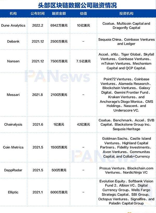 相比加密圈原生的投資機構,有不少傳統的投資機構在這一賽道多重下注,例如,Coatue領投了Chainalysis的E輪和DuneAnalytics的B輪,TigerGlobal領投了TheGraph,同時也參投了Nansen最新一輪的融資,Accel在Nansen這一輪中領投,同時在Chainalysis去年6月的一輪融資中跟投。