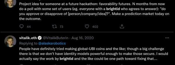 為未來的黑客馬拉松提供一個項目想法:好感度期貨。幾個月后針對一些用戶做一個民意調查(例如,每一個擁有brightid的用戶同意回答問題):"你贊成/不贊成...嗎?"。然后現在就對調查結果做一個預測市場。