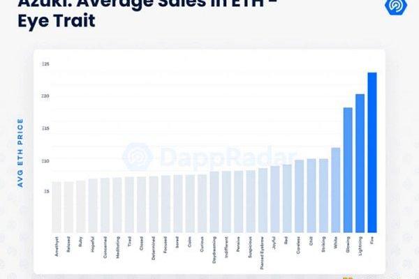 特殊特征對每個Azuki的價格也有很大的影響。螢火蟲(0.88%)和火(0.58%)特征系列評價最高。兩種類型的Azuki平均售價約為30ETH。雖然Sakura(0.8%)、FoxFire(0.86%)和Smoke(0.81%)的平均售價位于15ETH(40,000美元)關口,但它們的平均售價高于沒有特殊特征的AzukiNFT(93.71%),平均售價為7.92ETH。