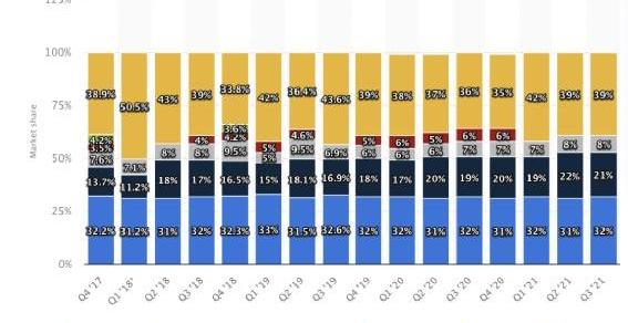 2021年,全球公有云服務的終端用戶開銷達到3,960億美元。其中,亞馬遜AWS以30%左右的市場份額常居榜首,除此外的主流云廠商也均為提供中心化服務的公司。
