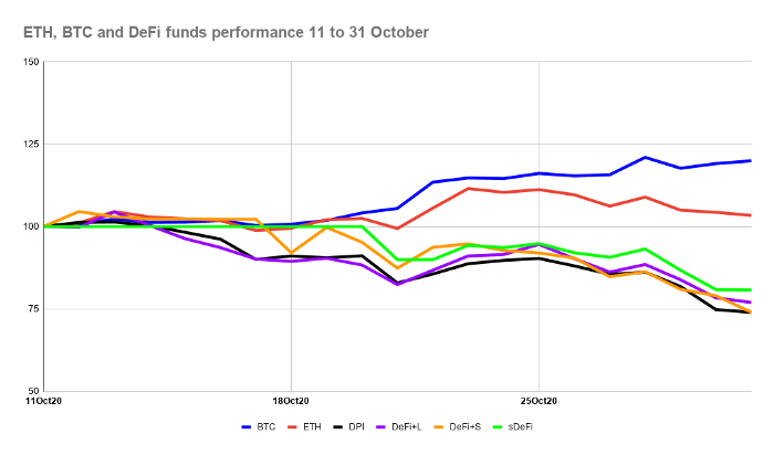 圖6:ETC、BTC和DeFi指數基金業績表現 10月11日至2020年10月31日。