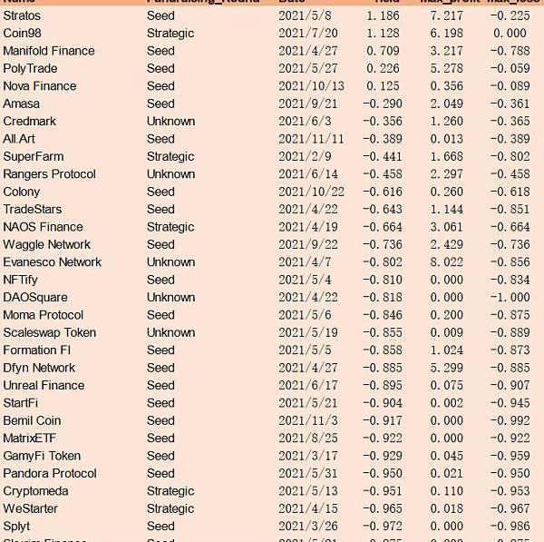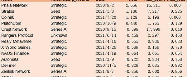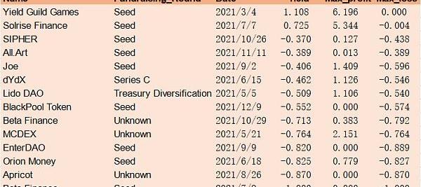 非常重要的一點是,項目token的損益不是從發行日開始算起,而是從融資信息公布日開始算。以AxieInfinity為例,該項目發行至今上漲了超過300倍,a16z與Paradigm等一眾知名VC都參與了其B輪融資,但如果按發行以來的收益率計算就會高估他們的實際收益率。事實上,B輪融資是去年10月公布的,而Axie的暴漲發生在去年夏天,如果只計算10月以來收益率,那么真實數字為-50%。