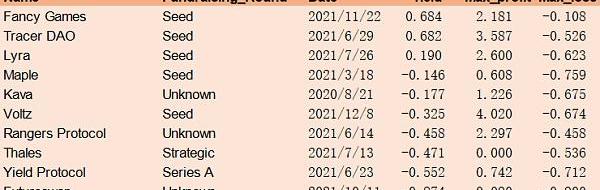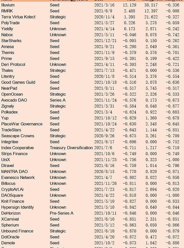 本文計算的所有收益率均不代表VC投資業績,只是衡量融資信息對于投資者的參考價值。部分項目存在多輪融資,上述589個項目共有684條融資數據。所有融資數據均來自DoveMetrics,價格數據均來自CoinGecko,數據截至2022年2月14日。
