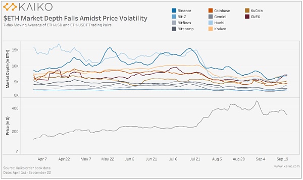 XRP/HKD-5.78%最近去中心化金融(DeFi)的發展展示了以太坊作為先進的點對點金融系統的基礎設施的潛力。在過去的幾個月里,這對該資產的流動性有何影響?最近的關注點大多集中在ETH在Uniswap等去中心化交易所上的作用,但通過研究中心化交易所的流動性,我們可以更好地了解專業做市商是如何應對過去一個月的價格變動的。