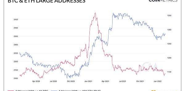 從零售興趣中解讀機構是加密研究中一個特別具有挑戰性的問題。一個粗略的代理是查看鏈上持有相對大量原生資產的地址數量。進入2021年,持有BTC和ETH高余額的地址數量增加,這與當時機構興趣正在回升的傳聞一致。然而,這一趨勢似乎在2021年下半年被打破。