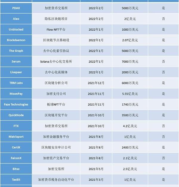 2021年3月以來,TigerGlobal開始大幅投資加密項目,其中包括加密貨幣稅務自動化平臺TaxBit、墨西哥加密交易所Bitso、區塊鏈安全審計公司CertiK、加密支付公司MoonPay、區塊鏈分析公司TRMLabs、去中心化流媒體Livepeer、去中心化索引協議TheGraph、隱私區塊鏈項目Aleo、Solana去中心化交易協議Serum、FlowNFT平臺Unblocked等至少15個項目。TigerGlobal也是投資加密項目最多的傳統風投機構之一。
