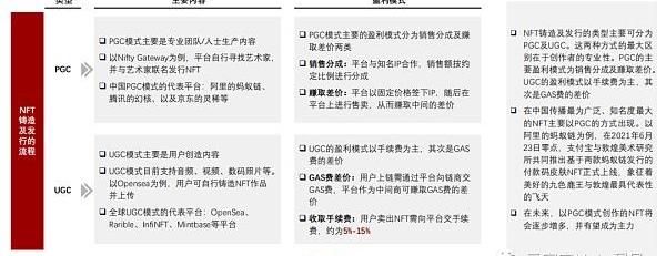 NFT鑄造及發行的類型主要可分為PGC及UGC。PGC的主要盈利模式為銷售分成及賺取差價。UGC的盈利模式以手續費為主,其次是GAS費的差價。