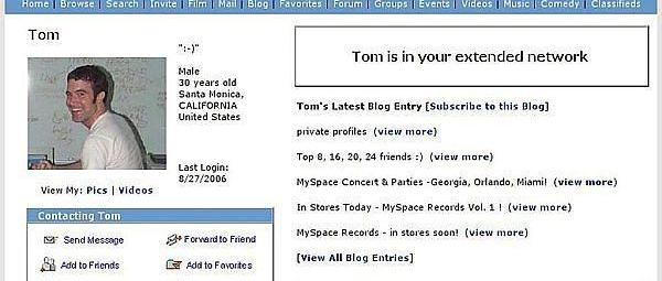 早期Web2.0公司MySpace創始人TomAnderson的MySpace主頁。所有注冊了Myspace賬號的用戶第一個自動添加的好友就是Tom。