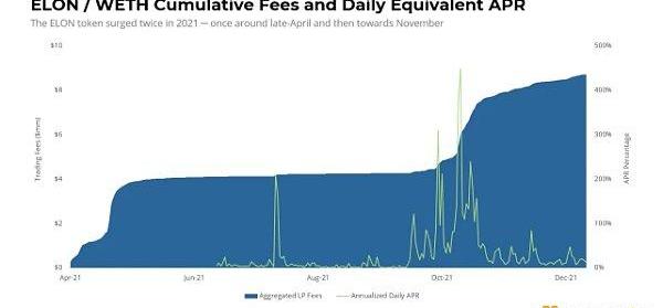毫不奇怪,當散戶對ELON的興趣活躍時,流動性提供者的收益率會波動并提供高回報。年化的每日APR達到近450%的峰值,盡管該指標在一年中的大部分時間里普遍低于10%。與SAITAMA類似,5月至10月期間流動性相對較低。ELON/WETH的總存款大約徘徊在600萬美元左右,盡管這個數字在第四季度確實有所回升。無論如何,這與上面USDC/WETH市場中價值$200mm左右的代幣儲備相去甚遠。