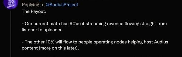 平臺自身的商業化思想和定位比較特殊,有非常強的去中心化色彩。團隊在20年3月宣稱,會把平臺收入的90%給創作者,10%給節點運營商,Audius分文不取(下圖)。