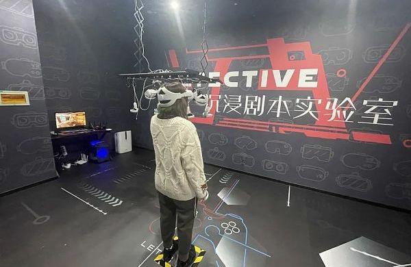 在H境探案館,記者看到,這里搭建了兩個推理室和一個沉浸劇本實驗室,VR體驗就在沉浸劇本實驗室內,一共有六套Quest2頭盔和手柄,主要用于劇本殺的搜證環節。