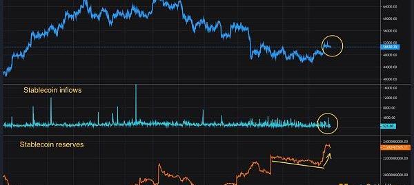 該圖表還顯示了穩定幣流入量,該指標表示代幣流入交易所錢包的總量。正如預期的那樣,該指標最近也出現了一些峰值。從另一方面來說,穩定幣儲備上升也對比特幣的價格有利,因為投資者通常在價格下跌期間利用將法幣兌換為穩定幣,以在市場下跌期間逢低買入。