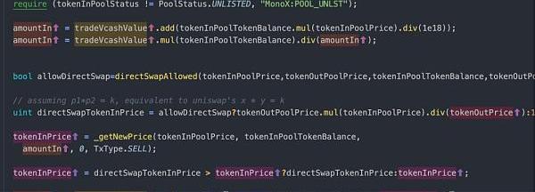 在該函數中由于tokenInPoolPrice是取的MONO代幣在池中的價格,而此價格在之前已被推高,導致tokenInPrice變大,計算最后的amountIn變小,用更少的MONO換出了原來相同數量的WETH、WBTC、MONO、USDC、USDT、DUCK、MIM、IMX等池子中的代幣。