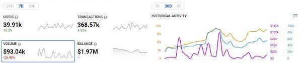 具體看一下本周數據,用戶數量5.8萬,下跌1%,周交易額4024萬美元,下跌40.63%,日交易額也從巔峰的1400多萬美元斷崖式下跌到170萬,差不多十分之一多一點。