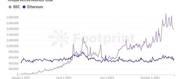 在活躍地址上面以太坊每日40萬至60萬之間波動,BSC每日在150萬至200萬波動,基本已是以太坊的3-5倍,而每日交易量甚至達到13倍之多。