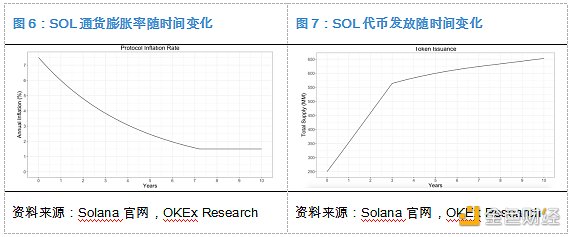SOL的通貨膨脹率或者SOL供應量隨時間的變化由協議設定,具體為Solana網絡設置的初識通貨膨脹率為15%,每年減少之前的15%,達到長期穩定率(1%-2%)后保持不變。下圖為Solana官方給出的示例。這種代幣發放設計使得早期SOL發放迅速,后期SOL供給緩慢增多,有利于早期參與者的利益,但是不利于早期的幣價穩定。