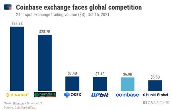 雖然Coinbase在上市的第一天就達到了1000億美元的目標估值,但其2021年9月的市值為540億美元。為了證明其最初的估值是合理的,Coinbase將不得不擊敗競爭對手并成為世界上最大的加密交易所。