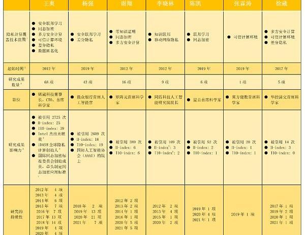 隱私計算行業在技術方面的壁壘相當高,對于隱私計算的研究更是需要深刻。從各隱私計算企業技術負責人或首席科學家學術成果來看,隱私計算覆蓋技術范圍、研究起始時間、研究成果數量、研究成果影響力以及研究的持續性等方面反映出行業的技術門檻。