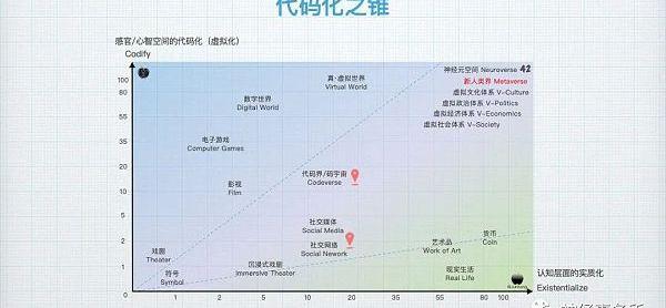 提出了“代碼化”與“實質化”的明暗線觀察視角,定性地建立了代碼化與實質化的發展坐標系,并嘗試用這兩個工具去觀察了一小段未來,最終憑此做了一些不負責任的判斷——其中一些對廣大Metaverse熱愛者可能不是很友好。
