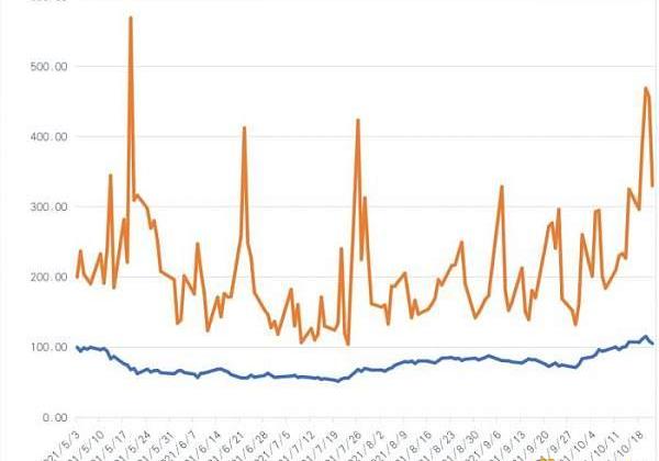 與以前一樣,比特幣仍然毫無價值,但隨著能源危機加深,天然氣、煤炭和石油價格暴漲,比特幣挖礦的成本肯定上升。10月13日,摩根大通總裁戴蒙再次抨擊比特幣“一文不值”,呼吁政府加強監管。但說者諄諄,聽者藐藐。戴蒙的一席話抵不過埃隆·馬斯克在社交媒體上的發文,也不抵凱瑟·伍德在散戶投資者粉絲中的影響力。如圖1,自今年5月以來,比特幣期貨價格和交易合同指數變化趨勢較為明顯,前者在震蕩中上漲,后者則緩慢上升。