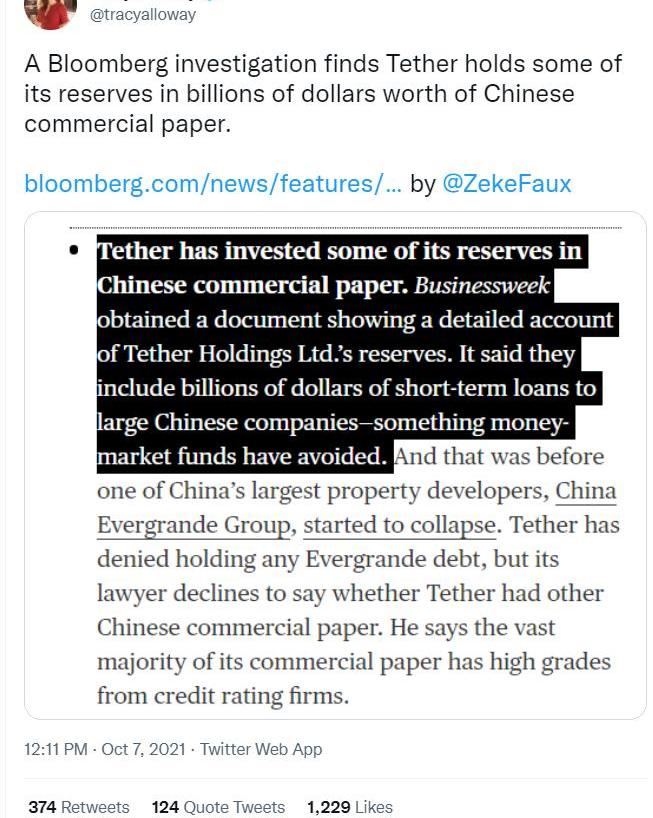 由于Tether沒有披露其合作伙伴和被它稱之為"商業票據"的短期債務的發行者的名字,讓人們愈發傾向于猜測最壞的結果——USDT貸款的很大一部分是借給中國公司的,而恒大可能就是其中之一。而最近,Tether宣布它沒有持有任何來自恒大的商業票據。