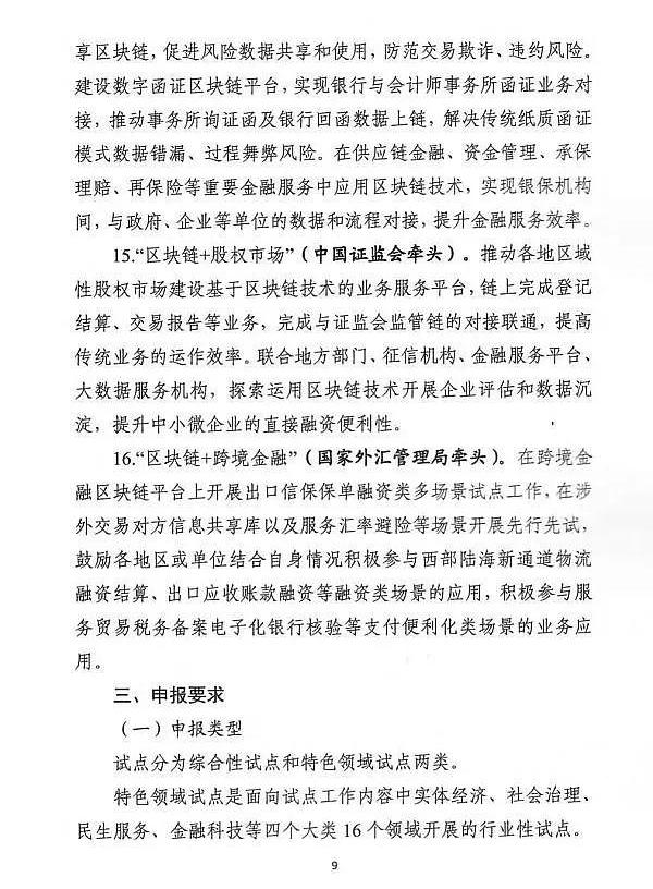 XRP/HKD-2.96%近日,中央網信辦會同中央宣傳部、國務院辦公廳[電子政務辦公室]、最高人民法院、最高人民檢察院、教育部、工業和信息化部、民政部、司法部、人力資源社會保障部、國家衛生健康委、中國人民銀行、國務院國資委、國家稅務總局、中國銀保監會、中國證監會、國家能源局、國家外匯管理局等18個部門和單位,組織開展國家區塊鏈創新應用試點行動。其中,申報試點分為特色領域試點和綜合性試點兩類: