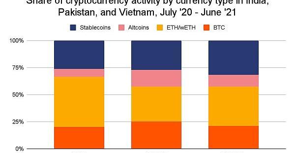 當我們查看按加密資產劃分的交易價值細分時,也會出現有趣的差異。例如,我們看到以太坊和wETH在印度活動中所占的份額大于越南或巴基斯坦。
