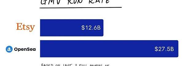 無論人們對這一領域的立場如何,這些數字都表明NFT遠不止是一個微不足道的興趣,而且OpenSea也不僅僅是一個神秘的小販。今年以來,NFT的銷售額已經超過130億美元,如果今年余下時間的銷售額與上一季度持平,那么每年的商品交易總量將達到250億美元。這種規模不僅使OpenSea領先于其競爭對手,而且超越了傳統的web2市場。在最近的季度報告中,Etsy報告了30.4億美元的GMV,OpenSea僅在8月份就超過了這一數字。