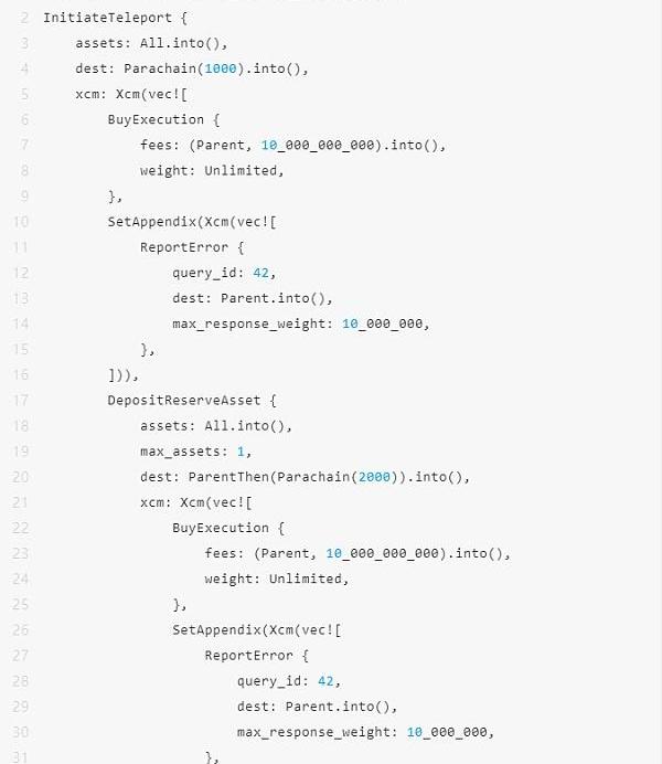 正如您所看到的,唯一的變化是引入了兩個SetAppendix指令,確保Statemint和parachain2000中的錯誤或缺乏錯誤將報告給中繼鏈。這假設中繼鏈已經設置為能夠識別和處理來自Statemint和parachain2000的QueryResponse消息,查詢ID為42,權重限制為1000萬。令人高興的是,這確實是基板支持的東西,但超出了范圍。