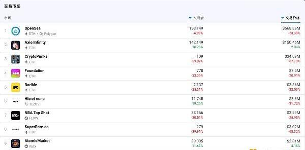 不僅如此,據DappRadar數據顯示,交易市場方面,排名前10的交易平臺中在最近24H中,僅除CryptoPunks、AtomicMarket外,其余無論是在交易者還是交易價格上均出現了不同程度的下跌。