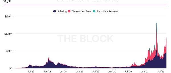 以太坊礦工收入結構,手續費收入占比快速提升